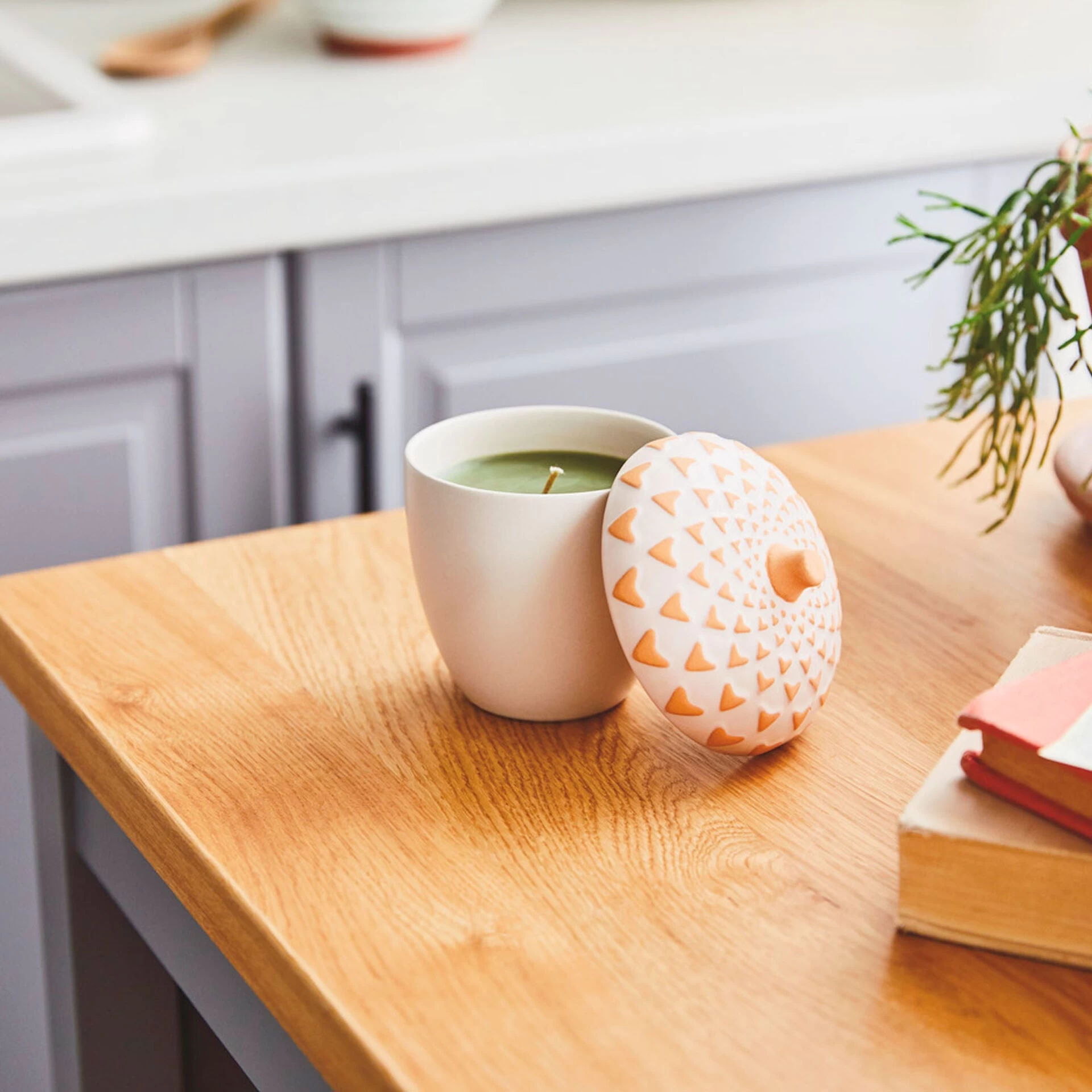 - Acorn-shaped ceramic jar with lid features soy-blend wax, single-wick scented candle.