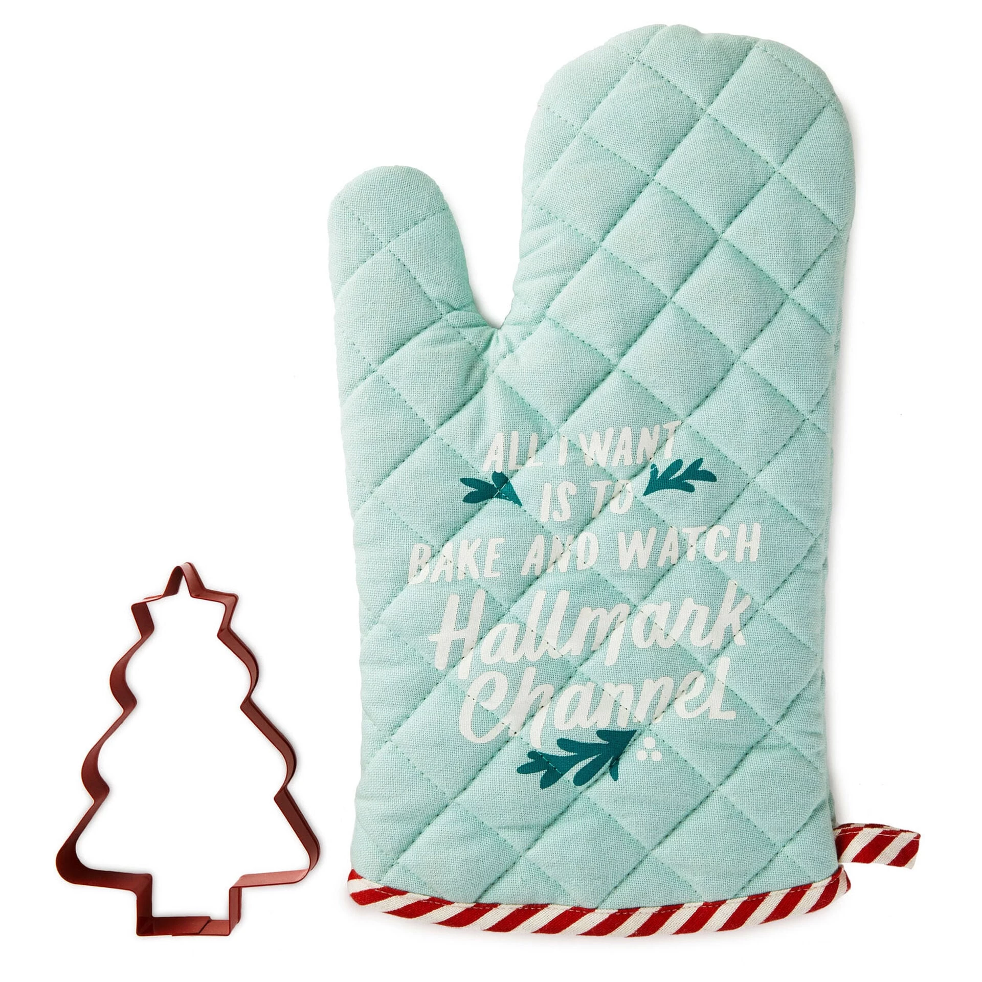 - Hallmark Channel gift set includes a mint green oven mitt peppermint stripe trim and a fun message plus a coated metal Christmas tree-shaped cookie cutter.