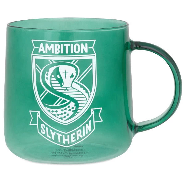 Raise a toast to an ambitious Harry Potter fan with this Slytherin green glass mug. Featuring a crest design of a serpent sigil flanked by a Slytherin banner and “Ambition” message in white, this translucent green handled glass cup is perfect for coffee, tea or any liquid refreshment you might crave.