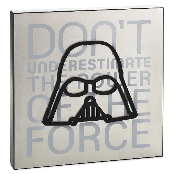 Bring the power of the dark side to a fan cave, office or any space with this eye-catching Star Wars art. The brushed metal surface features a message inspired by the films, accentuated with a minimalist laser-cut wood attachment shaped like the outline of Darth Vader’s helmet.