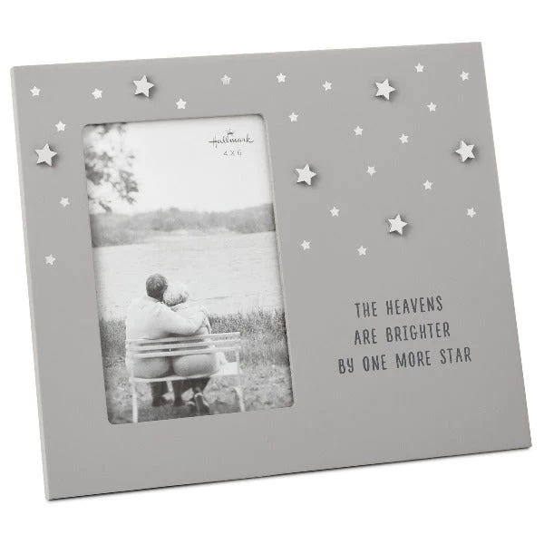 Seek comfort by knowing that the heavens are brighter by one more star. Display a special photograph of a loved one in this memorial picture frame. Painted gray with silver star-shaped attachments, the wood frame with its sweet message makes a thoughtful sympathy gift for someone who has lost a dear friend or family member.